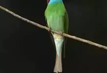 蓝喉蜂是蜂虎科蜂虎属鸟类。体长26-28厘米,嘴长而弯曲,有明显细长的中央尾羽。头部、颈部和背部为巧克力色,有黑色眼纹。喉部、腰部和尾羽为蓝色。腹部和两翼为绿色。幼鸟外观似成鸟,头部、颈部和背部为绿色,…全部>>