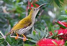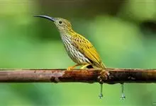 纹背捕蛛鸟:为太阳鸟科捕蛛鸟属的鸟类。是太阳鸟科中体型较大的一种,体重25-45克,体长160-210毫米。嘴粗长而尖且向下弯曲。上体橄榄黄色具黑色中央斑纹。下体淡黄白色满布黑色纵纹,尾具黑色次端斑。…全部>>
