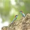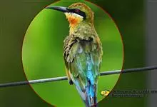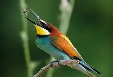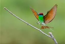 栗喉蜂虎是蜂虎科蜂虎属的鸟类。有热带鸟类羽毛艳丽的特征:喉部是栗红色的,黑色的过眼纹,翅膀和背部是绿色的,尾翼是蓝色的,飞行时翅膀下面的羽毛是橙黄色的,在阳光的照射下,它们全身闪烁着金属般的艳丽光泽,…全部>>