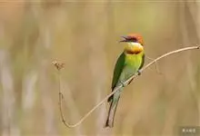 栗喉蜂虎是蜂虎科蜂虎属的鸟类。有热带鸟类羽毛艳丽的特征:喉部是栗红色的,黑色的过眼纹,翅膀和背部是绿色的,尾翼是蓝色的,飞行时翅膀下面的羽毛是橙黄色的,在阳光的照射下,它们全身闪烁着金属般的艳丽光泽,…全部>>