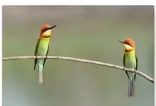 绿喉蜂虎是佛法僧目、蜂虎科的小型鸟类,共有9个亚种。身长22-25厘米,翼展29-30厘米,体重15-20克。喉绿色,额部、头顶至上背为锈红色,其余上体均为亮绿色。中央尾羽延长且端段狭细,…全部>>