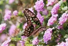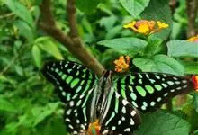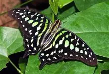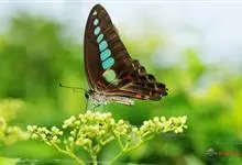 青带凤蝶Graphium sarpedon ,又名青凤蝶,是最普遍的中型凤蝶,飞行速度很快。青带凤蝶的翅膀中央有许多浅蓝色的斑点,很整齐地排列成一条直线。这些斑点由上而下逐渐变大,就像一条青色的带子。全部>>