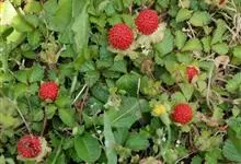 蛇莓 Teschem.),别名三爪凤、龙吐珠、东方草莓等,为蔷薇科蛇莓属的多年生草本植物。其根茎短,粗壮;匍匐茎多数;小叶片倒卵形至菱状长圆形;托叶窄卵形至宽披针形;花单生于叶腋,花瓣倒卵形,…全部>>