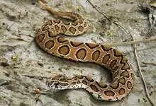 圆斑蝰,又称百步金钱豹、卢氏蝰蛇、锁蛇,是蛇亚目蝰科蝰亚科蝰属下的一种有毒蝰蛇。体粗壮,全长1m左右。头较大,三角形,前端较窄,后端较宽;鼻孔大,背位,无颊窝,头背为小鳞,起棱。…全部>>