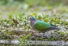 绿背金鸠体长约25厘米,是中等体型、尾甚短的地栖型斑鸠。下体粉红,头顶灰色,额白,腰灰,两翼具亮绿色。雌鸟头顶无灰色。飞行时背部两道黑色和白色的横纹清晰可见。主要栖息于2000米以下的山地森林中,…全部>>