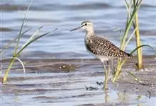 泽鹬:小型涉禽,体长19-26厘米。嘴长,相当纤细,直而尖。颜色为黑色,基部绿灰色,脚细长,暗灰绿色或黄绿色。夏季上体灰褐色具黑色斑,腰白色并向下呈楔形延伸。下体白色,颈、胸具细的黑色纵纹。…全部>>