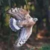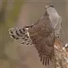 褐耳鹰的体形比苍鹰要小得多,为小型猛禽,体长为31-44厘米,体重217-325克。上体灰色,下体具赤褐色横斑。第6枚初级飞羽外羽片无缺刻,次外侧的4对尾羽具5道黑褐色横斑。眼先具白色短羽。…全部>>