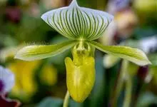 紫纹兜兰 Stein)是兰科兜兰属的地生或半附生植物。叶基生,叶片狭椭圆形或长圆状椭圆形,具暗绿色与浅黄绿色相间的网格斑,背面浅绿色;花苞片卵状披针形,中萼片白色而有紫色或紫红色粗脉纹,…全部>>