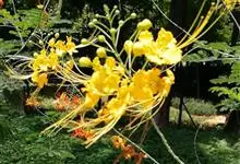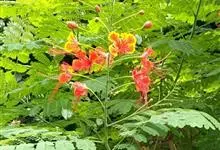 洋金凤 Sw.),豆科小凤花属灌木状或小乔木植物,枝无毛,绿或粉绿色;二回羽状复叶;总状花序伞房状,萼片无毛,花瓣橙红或黄色,圆形,花丝红色,子房无毛,花柱橙黄色;荚果窄而薄,…全部>>