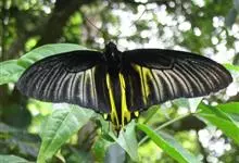 金裳凤蝶是凤蝶科、裳凤蝶属的动物。金裳凤蝶身体呈黑色,头、颈和胸侧有红毛,腹部有黑黄两色相间条纹,雄蝶前翅黑色,具黑天鹅绒光泽,各脉两侧灰白色,后翅金黄色,各室外缘有等腰三角形黑斑1枚,斑内侧有晕,…全部>>