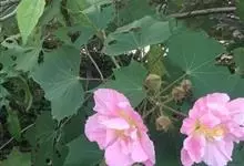 木芙蓉,锦葵科木槿属落叶灌木或小乔木。小枝上有细绒毛;叶片为卵状心形,托叶为披针形,常早落;花单生,花萼为钟形,花冠初为白色或淡红色,后逐渐变为深红色;果实为扁球形,有淡黄色的毛附着。花期8到10月。…全部>>