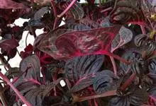 血苋是苋科血苋属的多年生草本植物。高1-2米;茎粗壮,常带红色,有分枝,有纵棱及沟;叶片宽卵形至近圆形,两面有贴生毛,紫红色;雌雄异株,花成顶生及腋生,圆锥花序,由多数穗状花序形成,苞片及小苞片呈卵形,…全部>>