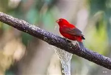 血雀雀科朱雀属鸟类,体重36-49克;体长155-182毫米。雄鸟除眼先、翼与尾为黑色外,通体为鲜红色;嘴鲜黄;雌鸟暗橄榄绿色,羽端较淡或带黄色;腰鲜黄;嘴较暗。虹膜褐色;嘴黄色;腿和脚褐色。…全部>>