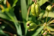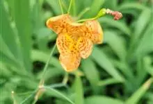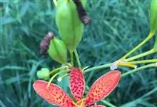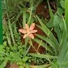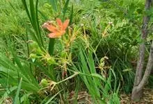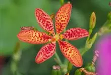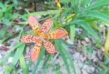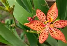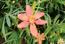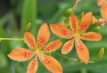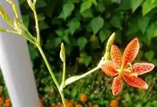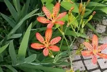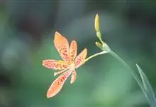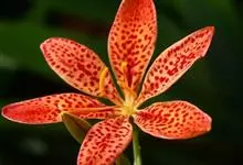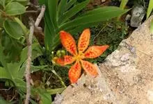 射干 Redouté)是鸢尾科射干属多年生草本植物。根状茎为不规则的块状,斜黄色或黄褐色;花橙红色,散生紫褐色的斑点;花药呈条形;子房下位,倒卵形;蒴果倒卵形或长椭圆形;种子圆球形,黑紫色,有光泽。…全部>>