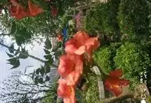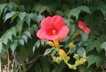 凌霄 Schum.),别名上树龙、五爪龙、九龙下海等,为紫葳科凌霄属的攀援藤本植物。其茎木质,以气生根攀附于它物之上。叶对生,为奇数羽状复叶;小叶卵形至卵状披针形,边缘有粗锯齿;顶生疏散的短圆锥花序,…全部>>