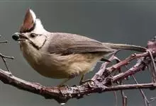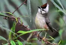 褐头凤鹛小型鸟类,体长12~13厘米。头顶有可竖立的红褐色羽冠,头侧、枕、颊、喉和下体白色,羽冠两侧黑色,头的两侧各有一条黑线,其下端与黑色颧纹末端相接,上端与从眼后伸出的一条黑线相连,…全部>>