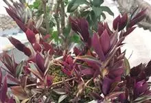 吊竹梅是鸭跖草科紫露草属的多年生草本植物;茎半肉质,柔弱披散至悬垂;叶椭圆形至长圆形,无柄,先端急尖至渐尖,基部鞘状抱茎,叶面紫绿色而杂有银白色,叶背紫色,全缘;花聚生于顶生叶状苞内,…全部>>