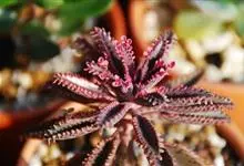 棒叶落地生根是景天科、落地生根属植物。茎直立、粉褐色。叶圆棒形,上表面有沟、粉色,有红褐斑。叶片交互对生,交叉排列成十字形。叶端锯齿上长有很小的幼株、落地后即可生根成活。原产非洲马达加斯加。…全部>>