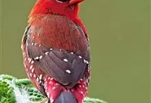 红梅花雀小型鸟类,体长9-10厘米。雄鸟通体朱红色,背、肩、胸等满布白色小斑点,两翅和尾黑褐色均具白色端斑,嘴红色,脚蜡黄色。雌鸟上体淡褐色或赭褐色,翅上中覆羽、大覆羽和内侧飞羽末端具白色斑点,…全部>>