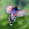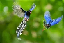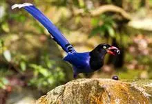 台湾蓝鹊:体长64至65厘米,翼展18至21厘米,尾长约40厘米,尾羽长占了总体长的三分之二。头、脸、颈、喉、胸都是黑色,黄色的眼珠包围黑色的瞳孔,鲜红色的鸟喙、双脚,…全部>>