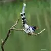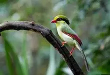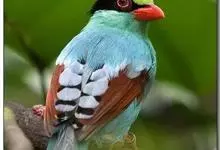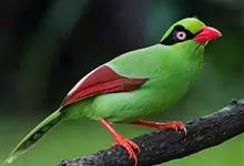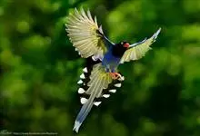 蓝绿鹊:中型鸟类,共有5个亚种。体长36-38厘米。尾长,嘴、脚红色。通体羽色主要为草绿色,宽阔的黑色贯眼纹向后延伸到后颈,在绿色的头侧极为醒目。两翅栗红色,内侧飞羽具黑色次端斑和白色尖端。尾绿色,…全部>>