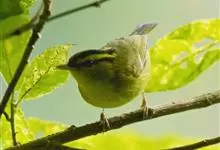 黑眉柳莺,小型鸟类,体长9-10厘米。上体橄榄绿色,头顶中央自额基至后颈有一条淡绿黄色中央冠纹极为显著,头顶两侧各有一条黑色侧冠纹,眉纹黄色,贯眼纹黑色。翅上有两道淡黄色翅斑,…全部>>