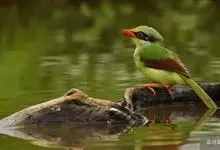 蓝绿鹊:中型鸟类,共有5个亚种。体长36-38厘米。尾长,嘴、脚红色。通体羽色主要为草绿色,宽阔的黑色贯眼纹向后延伸到后颈,在绿色的头侧极为醒目。两翅栗红色,内侧飞羽具黑色次端斑和白色尖端。尾绿色,…全部>>