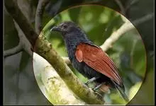 褐翅鸦鹃,是鹃形目鸦鹃科鸦鹃属的鸟类。褐翅鸦鹃的身体为黑色;头颈和胸带蓝紫色金属光泽并具黑亮的羽干纹,下胸至腹部泛金属绿光泽;两翼和肩部为棕栗色,外侧飞羽具暗色羽端,尾羽闪铜绿色光泽;虹膜赤红色,…全部>>