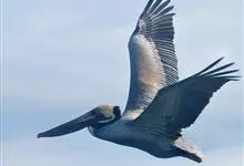 褐鹈鹕:是鹈鹕家族中体型最小的成员。体型粗大,体重6.5-9千克。嘴形宽大直长,上嘴尖端朝下弯曲,呈钩状;下嘴分左右二支,其间有一巨大而能扩缩的皮肤喉囊;鼻孔小,而位于嘴基。眼前部裸出。颈长而较细小…全部>>