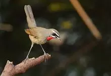 红点颏:是鸟纲、鹟科的鸣禽。又名西伯利亚歌鸲。体长14-17厘米,体重16-27克。雄鸟头部、上体主要为橄榄褐色。眉纹白色。颏部、喉部红色,周围有黑色狭纹。胸部灰色,腹部白色。雌鸟颏部、喉部不呈赤红色,…全部>>