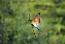 栗喉蜂虎是蜂虎科蜂虎属的鸟类。有热带鸟类羽毛艳丽的特征:喉部是栗红色的,黑色的过眼纹,翅膀和背部是绿色的,尾翼是蓝色的,飞行时翅膀下面的羽毛是橙黄色的,在阳光的照射下,它们全身闪烁着金属般的艳丽光泽,…全部>>
