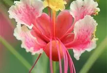 洋金凤 Sw.)是豆科、云实属植物。枝光滑,绿色或粉绿色,散生疏刺。二回羽状复叶;羽片4-8对,对生;小叶7-11对,长圆形或倒卵形,顶端凹缺;小叶柄短。总状花序近伞房状,顶生或腋生,…全部>>