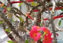 铁海棠为大戟科大戟属蔓生灌木植物;茎多分枝,具纵棱,呈旋转状;叶互生,通常集中于嫩枝上;每个花序基部边缘具微小的红色尖头;苞叶先端圆且具小尖头,无柄,上面鲜红色,下面淡红色;苞片丝状;子房光滑无毛,…全部>>