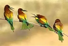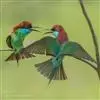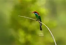 栗喉蜂虎是蜂虎科蜂虎属的鸟类。有热带鸟类羽毛艳丽的特征:喉部是栗红色的,黑色的过眼纹,翅膀和背部是绿色的,尾翼是蓝色的,飞行时翅膀下面的羽毛是橙黄色的,在阳光的照射下,它们全身闪烁着金属般的艳丽光泽,…全部>>
