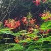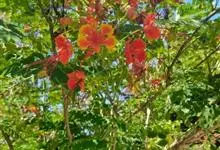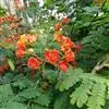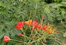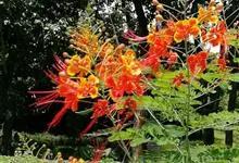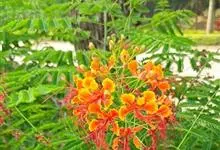 洋金凤 Sw.),豆科小凤花属灌木状或小乔木植物,枝无毛,绿或粉绿色;二回羽状复叶;总状花序伞房状,萼片无毛,花瓣橙红或黄色,圆形,花丝红色,子房无毛,花柱橙黄色;荚果窄而薄,…全部>>