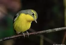 黑脸鹟莺:体长10厘米,是有特色的体小而多彩的莺鸟。粗眉纹,颏、喉及尾下覆羽黄色,脸罩黑,头顶及颈背灰色,上体绿,无翼纹,腹白。虹膜褐色;上嘴色深,下嘴肉色;脚偏绿色。…全部>>