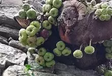 大果榕是桑科榕属的小乔木,株高可达10米;幼枝被柔毛;叶互生,宽卵状心形或近圆形;雄花无梗、匙形、花丝长,雌花生于雌株榕果内,子房白色;榕果簇生于树干基部或老茎短枝上、扁球形或陀螺形,…全部>>