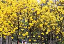黄金风铃木Nichols),别称:黄花风铃木、黄丝风铃木、金花风铃木、伊蓓树、毛风铃、巴西风铃木。原产墨西哥、中美洲、南美洲,是巴西的国花。每年3、4月开花,花冠漏斗形、五裂,似风铃状,花缘皱曲,花…全部>>