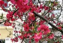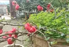 贴梗海棠Nakai)是蔷薇科、木瓜海棠属植物。落叶灌木,高达2米,枝条直立开展,有刺。叶片卵形至椭圆形,稀长椭圆形,长3-9厘米,宽1.5-5厘米。花先叶开放,3-5朵簇生于二年生老枝上。…全部>>