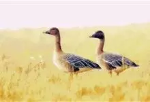 灰雁:体长70-90厘米,翼展147-182厘米,体重2.5-4千克,寿命17年。体大而肥胖。嘴、脚肉色,上体灰褐色,下体污白色,飞行时双翼拍打用力,振翅频率高。脖子较长。腿位于身体的中心支点,…全部>>