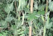 扁豆 Sweet)是豆科扁豆属多年生缠绕藤本植物,又名鹊豆、沿篱豆、藤豆等。全株几无毛,茎长可达6米。羽状复叶具3小叶;托叶基着,叶片披针形;小托叶线形,小叶宽三角状卵形,宽与长相等,…全部>>
