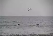 真海豚,身体细而流线型。体色十分复杂而独特,通常十字交叉型,黄褐色在前灰色在后,背面黑色向下延伸,在背鳍下面形成V形区域。具白色胸斑。头前额喙平缓向倾斜,喙细长,相对较短。黑唇末端白色。背鳍大,…全部>>