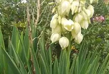 丝兰是天门冬科丝兰属植物。茎短或无茎;圆锥花序烛台状,花朵杯形,下垂,白色;叶基部呈剑形放射状,被白粉,革质;花期8—10月。丝兰原产于北美,在中国长江流域一带和华北地区均有栽培,长江以南地区也有分布。…全部>>