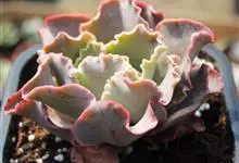 女王花笠,又名扇贝石莲花、女王花舞笠,是景天科拟石莲花属的多肉植物。由美国加利福尼亚州的育种师Dick Wright于1964年培育。特征是呈大波浪状褶皱的红色叶缘和气质高贵的粉紫色调。…全部>>