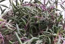 紫玄月是菊科厚敦菊属多年生肉质草本植物。蔓长30-60厘米;茎紫色;叶对生或互生茎上肉质,叶片细圆柱形,中间粗两端细稍弯曲;花序着生于叶腋,头状花序,舌状花黄色,管状花黄色;花期全年。…全部>>