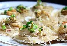 豉汁扇贝,山东威海著名的特色小吃,做法简单,咸鲜味十足。扇贝放在装有清水的盆里泡上一个小时;然后用刷子刷干净外壳;把扇贝用小刀撬开,把内脏及腮去除;把用温水泡软的粉丝放到扇贝上;大蒜成蒜蓉;在炒锅里…全部>>