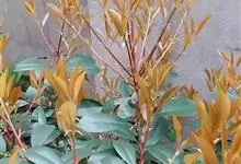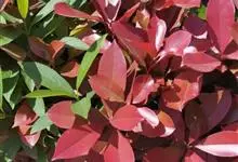 红叶石楠 是蔷薇科,石楠属杂交种,为常绿小乔木或灌木,乔木高可达5米、灌木高可达2米。叶片革质,长圆形至倒卵状、披针形,叶端渐尖,叶基楔形,叶缘有带腺的锯齿,花多而密,复伞房花序,花白色,梨果黄红色,…全部>>