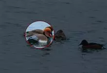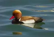 赤嘴潜鸭俗称大红头,是大型鸭类,个体比绿头鸭小,体长45-55厘米,体重1千克左右。雄鸟头浓栗色,具淡棕黄色羽冠。上体暗褐色,翼镜白色,嘴赤红色。下体黑色,两胁白色,特征极明显,野外容易辨别。…全部>>