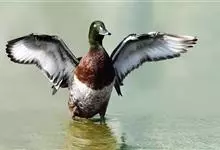 凤头潜鸭又名泽凫、凤头鸭,是雁形目鸭科潜鸭属中型潜水鸭。其体长约40厘米;雌雄均有长的辫状冠羽,嘴宽大,眼黄色;雄鸟全体黑色,但腹部、两胁和翼镜为白色;雌鸟全体大致为褐色,两胁有褐色斑纹,腹部白色。…全部>>