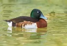 青头潜鸭,是雁形目鸭科潜鸭属的迁徙性鸟类。雄性头部和颈部为黑色,有绿色光泽,上体为黑褐色,尾下和翼下覆羽为白色。雌性头部和颈部为黑褐色,腹部以白色羽毛为主,两翅、腰和尾上尾下覆羽与雄性基本相同。…全部>>
